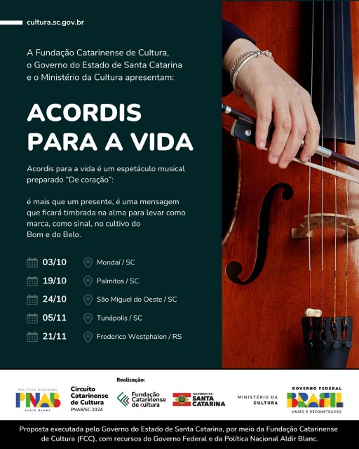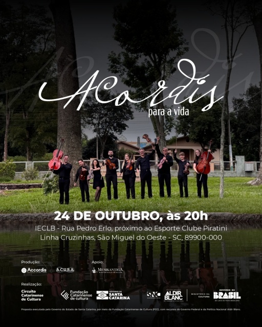 A Camerata Cordis, grupo formado por músicos do Oeste catarinense e Noroeste gaúcho, realiza nesta sexta-feira (24), às 20h, uma apresentação especial em São Miguel do Oeste. O concerto integra a turnê “aCORDIS para a VIDA”, contemplada pela Fundação Catarinense de Cultura e pela PNAB – Política Nacional Aldir Blanc, e acontecerá na Igreja Evangélica de Linha Cruzinhas, com entrada gratuita.