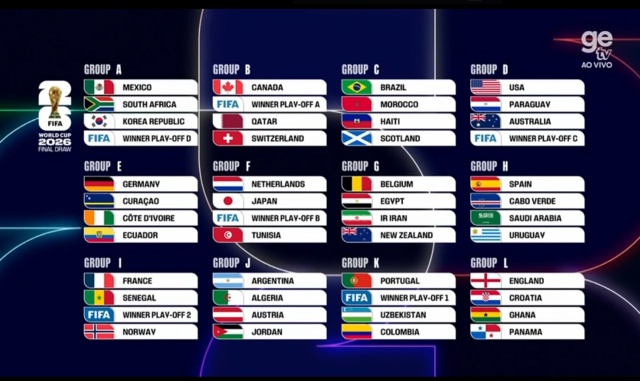 A Fifa sorteou nesta sexta-feira os 12 grupos da Copa do Mundo de 2026, em evento realizado em Washington. O Brasil foi sorteado para o grupo C e terá como adversários Marrocos, Haiti e Escócia. A estreia da Seleção será diante dos marroquinos, no dia 13 de junho (sábado). O duelo contra o Haiti será no dia 19 (sexta-feira), e o confronto contra a Escócia, no dia 24 (quarta-feira). Os jogos serão realizados em cidades do Leste dos Estados Unidos: as possibilidades são Atlanta, Boston, Miami, Nova York/Nova Jersey e Filadélfia. A tabela completa será divulgada neste sábado.