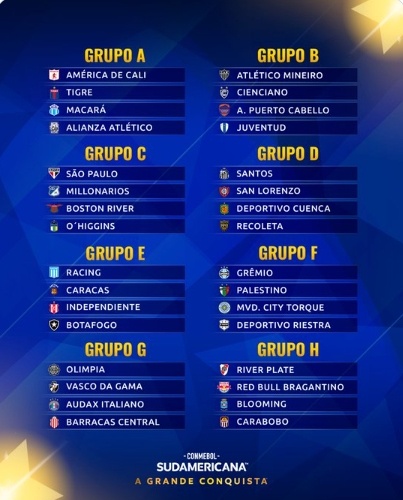 Por outro lado, o Santos terá um grupo mais equilibrado, com San Lorenzo (ARG), Deportivo Cuenca (EQU) e Recoleta (PAR). Já o Botafogo integra uma das chaves mais complicadas, ao lado de Racing (ARG), Caracas (VEN) e Independiente (BOL).