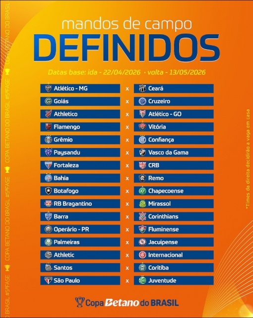Em sorteio realizado na sede da CBF, no Rio de Janeiro, na tarde desta segunda-feira (23), a dupla Gre-Nal e a Chape conheceram seus adversários e os mandos de campo na 5ª fase da Copa do Brasil 2026.