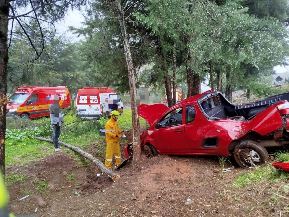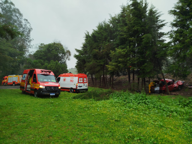 Um veículo ficou preso entre algumas árvores após sair da pista e capotar na BR-282, em Cunha Porã, durante o domingo (03). De acordo com as equipes de socorro, duas pessoas foram conduzidas ao hospital.