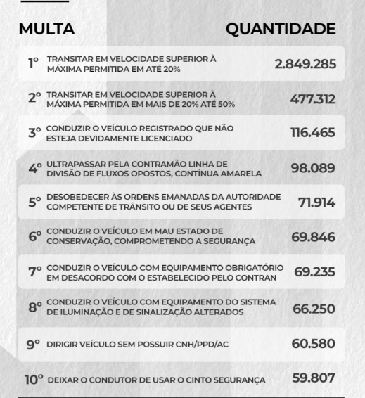 O aumento foi maior nas multas de excesso de velocidade. Transitar em velocidade superior à máxima permitida em até 20% teve 2,8 milhões de registros, ante 2 milhões em 2024, o que representa 39% de alta. A de exceder a velocidade em mais de 20% e até 50% passou de 339 mil, no ano passado, para 477,3 mil, em 2025, aumento de 40%.