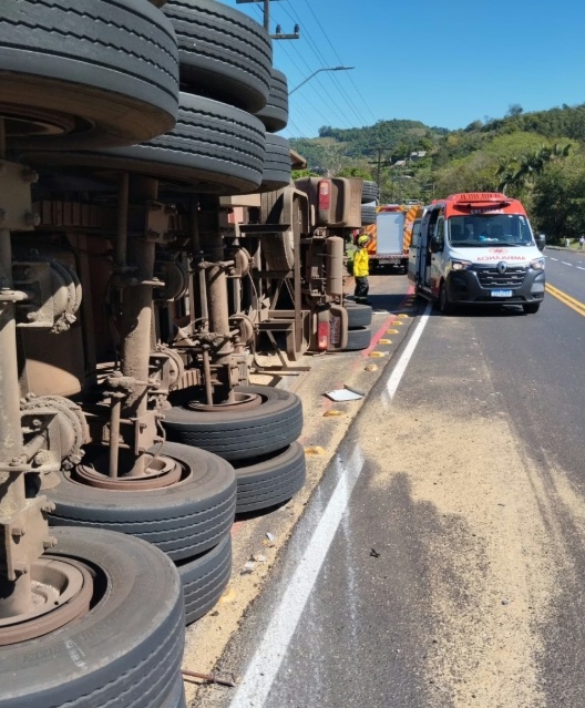 Um caminhão capotou e acabou colidindo com um carro na SC-283, no Balneário de Pratas, em São Carlos, Oeste catarinense. O motorista do caminhão ficou ferido e precisou de atendimento médico, na manhã desta sexta-feira (26).