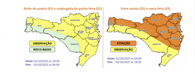 A Defesa Civil de Santa Catarina emitiu um aviso meteorológico para a ocorrência de chuvas persistentes e intensas entre a noite desta quarta-feira (1º) e a sexta-feira (3). Os acumulados devem atingir principalmente as regiões do Grande Oeste, Vale do Itajaí, Grande Florianópolis e norte catarinense.