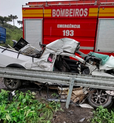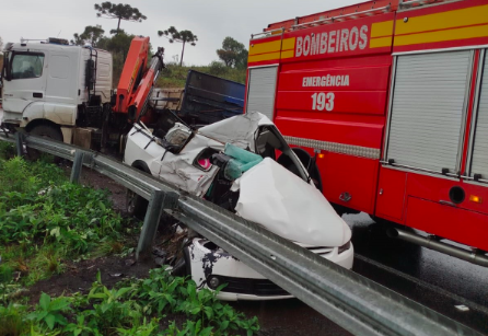 De acordo com o Corpo de Bombeiros, a colisão ocorreu por volta das 10h30, em um trecho conhecido como “curva dos moranguinhos”. O veículo foi atingido na lateral por uma carreta com placas de Apiúna (SC) e acabou prensado contra o guard-rail às margens da rodovia.