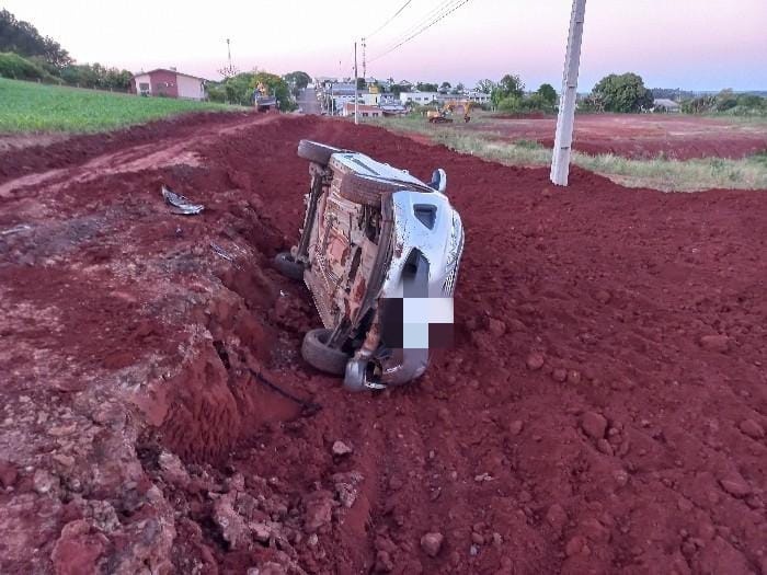 volta das 4h40, foi localizado o carro tombado e abandonado em uma rua em obras