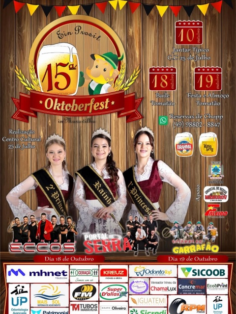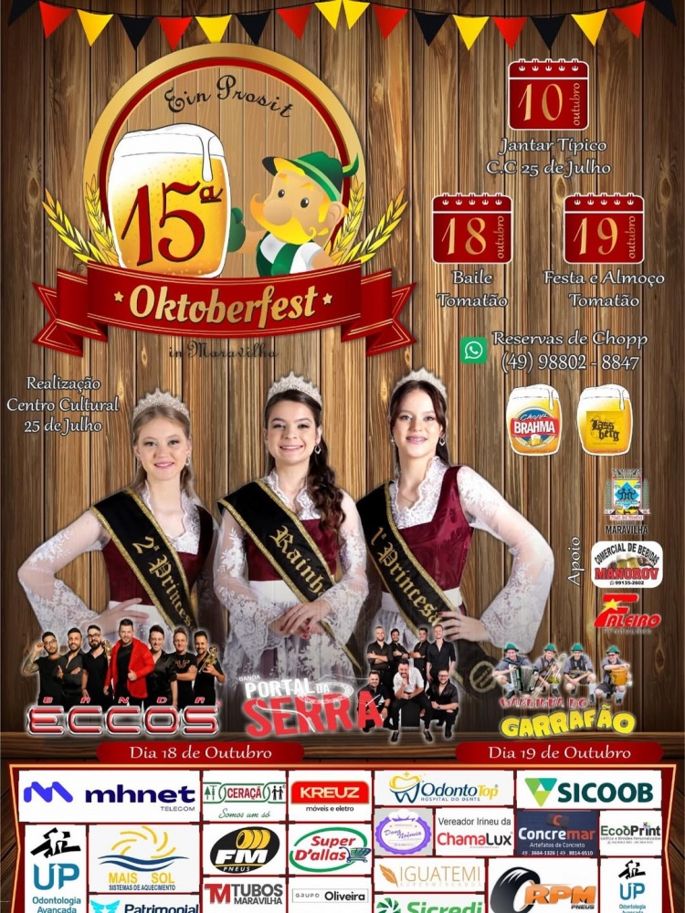 A programação da Oktoberfest In Maravilha continua nos próximos dias. Na sexta-feira (17), a partir do fim da tarde, haverá a concentração para a sangria do barril na Avenida Sete de Setembro, próximo ao posto da Ceraçá. No sábado (18), o tradicional baile acontece no Tomatão, com animação das bandas Eccos e Portal da Serra. Já no domingo (18), a festa se encerra com apresentações culturais, almoço típico e matinê com o Bailinho do Garrafão.
