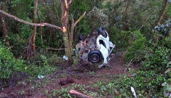Com o impacto, o Sandero saiu da pista e despencou cerca de 15 metros em uma ribanceira. O Jetta, com placas de São Miguel do Oeste, permaneceu sobre a rodovia. O motorista, de 18 anos, foi encontrado consciente e fora do veículo. Já a passageira do banco da frente, de 19 anos, também estava consciente, mas apresentava suspeita de hemorragia interna. Ambos foram levados de ambulância para o Hospital de Alfredo Wagner.