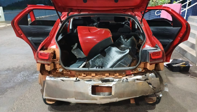 Com o uso de ferramentas, os agentes encontraram o carregamento escondido no interior do para-choque e nas laterais do porta-malas do automóvel. A droga estava distribuída em diversos fardos. O condutor do carro confessou aos PRFs que o entorpecente seria levado de Foz do Iguaçu (PR) para a cidade catarinense de Itapiranga. O homem informou que a passageira não tinha conhecimento do transporte da carga.