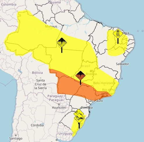 O Instituto Nacional de Meteorologia (Inmet) emitiu alerta laranja, que indica perigo, para sete estados do Brasil nesta segunda-feira (13). O aviso é válido até 10h de terça-feira (14) e atinge os estados de Goiás, Mato Grosso, Mato Grosso do Sul, Minas Gerais, Paraná, Rio de Janeiro e São Paulo.