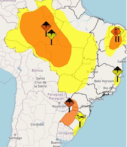 O alerta também inclui regiões, como Centro Ocidental Rio-grandense, Noroeste Rio-grandense, Sudoeste Rio-grandense, Centro Ocidental Paranaense, Sudoeste Paranaense, Oeste Paranaense, Centro Oriental Rio-grandense e Centro-Sul Paranaense.
