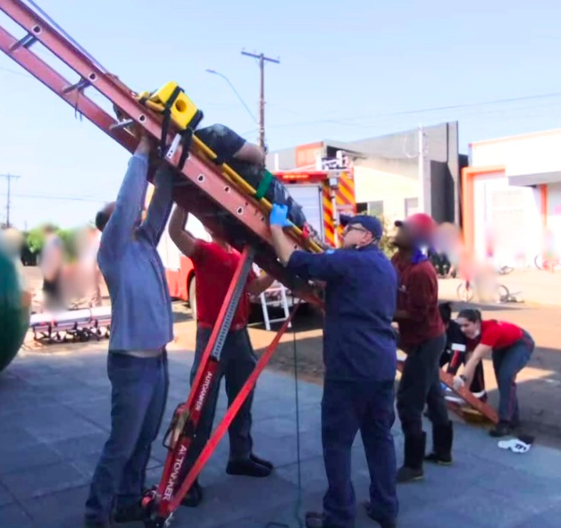 O acidente ocorreu em uma construção localizada na Rua Palmitos, no Bairro Bela Vista. A vítima precisou ser resgatada do segundo pavimento, com o auxílio de uma escada, para garantir uma remoção segura até o térreo.