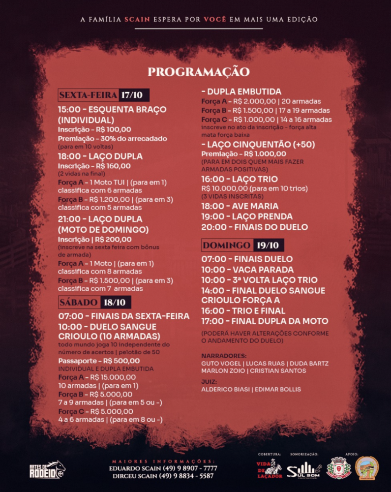A programação intensa inclui diversas modalidades de tiro de laço, além de serviços de copa e cozinha. O ponto alto da competição é o Duelo Sangue Crioulo, que distribuirá R$ 15.000,00 na Força A.