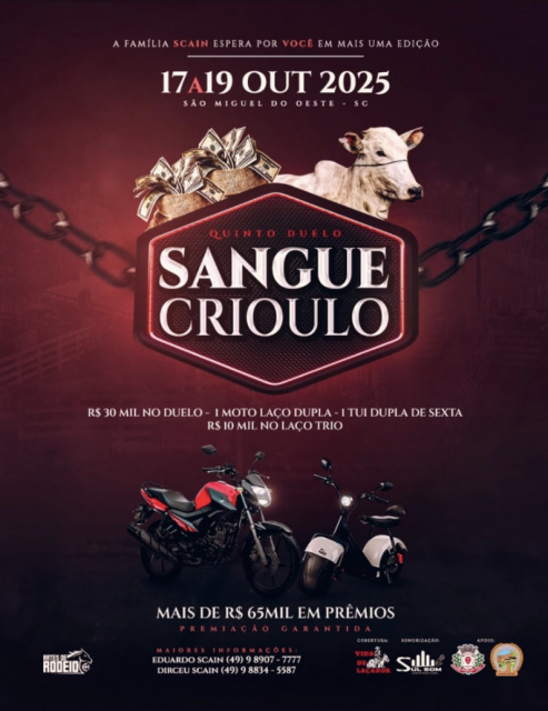 Começa nesta sexta-feira (17) e segue até domingo (19) a 5ª edição do Rodeio Duelo Sangue Crioulo no Parque de Exposições Rineu Gransotto, em São Miguel do Oeste. O evento reunirá peões e tradicionalistas dos três estados da Região Sul do Brasil.