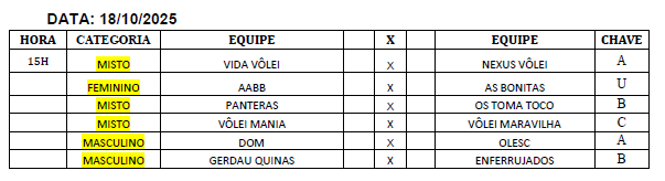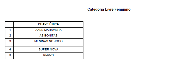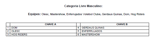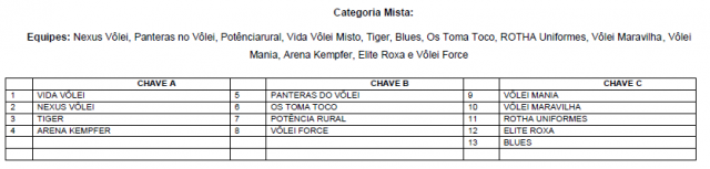 A categoria Mista conta com 13 equipes, divididas em três chaves. Já a categoria Livre Masculino reúne o total de seis equipes, divididas em duas chaves. Com cinco equipes, a categoria Livre Feminino conta com apenas uma chave. O chaveamento de cada categoria ficou definido da seguinte forma: