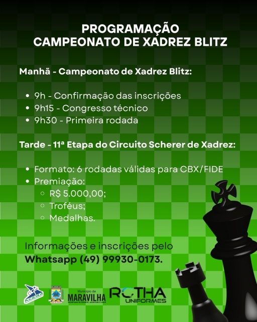 O xadrez vai movimentar o mês de outubro em Maravilha, com duas importantes competições no município. Neste sábado (25), ocorre o Campeonato de Xadrez Blitz – Taça Rotha Uniformes e a 11ª Etapa do Circuito Scherer de Xadrez. Os jogos serão realizados no Parque de Exposições “Tomatão”.