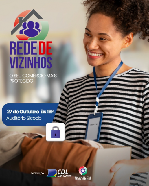 A Câmara de Dirigentes Lojistas (CDL) de São Miguel do Oeste, em parceria com a Polícia Militar de Santa Catarina, promove no dia 27 de outubro, às 19h, o lançamento oficial da Rede de Vizinhos Comercial. O evento será realizado no Auditório do Sicoob São Miguel e é gratuito para empresários e profissionais do comércio interessados em participar.