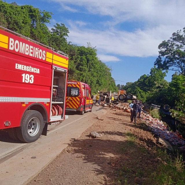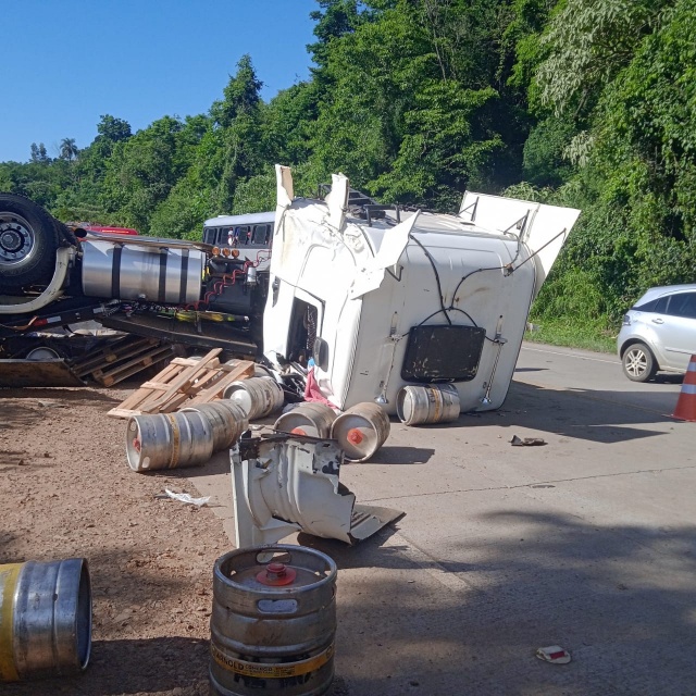 Conforme informações apuradas no local, um caminhão Scania branco, com placas Mercosul, colidiu na traseira de um caminhão prancha, que transportava um rolo compressor. A Scania estava carregada com barris de chope e latas de cerveja. Com o impacto, o caminhão prancha caiu em uma ribanceira de cerca de 10 metros.
