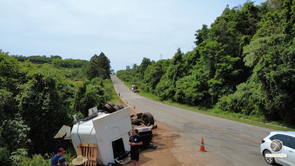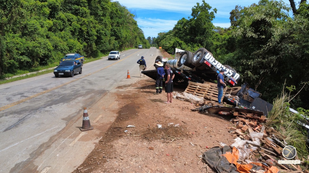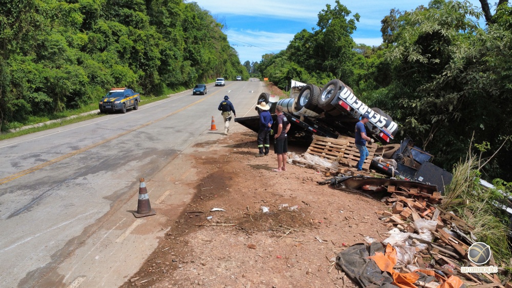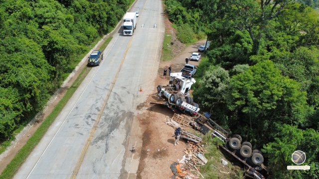 A interdição ocorre na Linha Guataparaema, onde duas carretas colidiram na quarta-feira (22). Uma das carretas, que transportava barris de chopp (parte da carga foi saqueada), e o caminhão prancha ficaram sobre a pista.