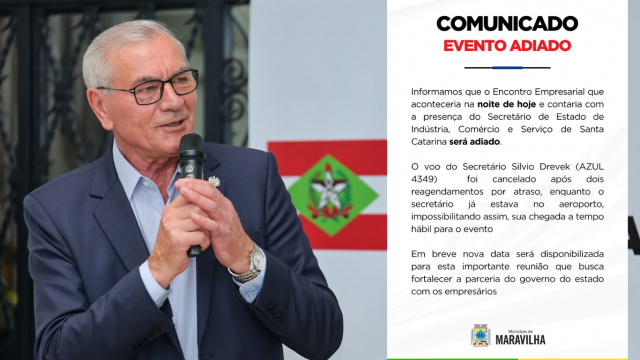 De acordo com o comunicado emitido pelo Município de Maravilha, o secretário já estava no aeroporto quando, após dois reagendamentos por atraso, o voo foi cancelado, impossibilitando sua chegada em tempo hábil ao evento. Diante da situação, o evento marcado para hoje foi cancelado, mas uma nova data será agendada e informada à comunidade.
