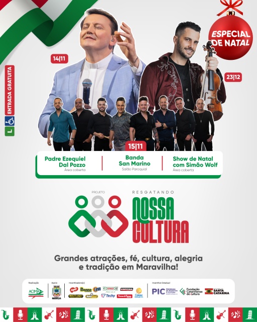 O Projeto Resgatando Nossa Cultura segue movimentando Maravilha através de uma programação repleta de cultura, música e integração. As próximas atividades acontecem nos dias 14 e 15 de novembro, com shows, apresentações de corais e jantar italiano, e encerram em dezembro com um especial de Natal. Realizado pela Associação Cultural Italiana de Maravilha (ACIMA), o projeto conta com o apoio do Município de Maravilha, e incentivo da Fundação Catarinense através do Programa de Incentivo a Cultura (PIC) do Governo do Estado de Santa Catarina.