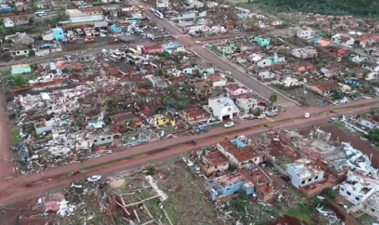 Imagens aéreas registradas na manhã deste sábado (8) mostram o tamanho da devastação em Rio Bonito do Iguaçu, no Centro-Sul do Paraná. Horas após a passagem de um tornado de nível F-2, a cidade exibe um cenário de destruição impressionante: casas reduzidas a escombros, ruas cobertas por destroços e postes caídos por todos os lados.