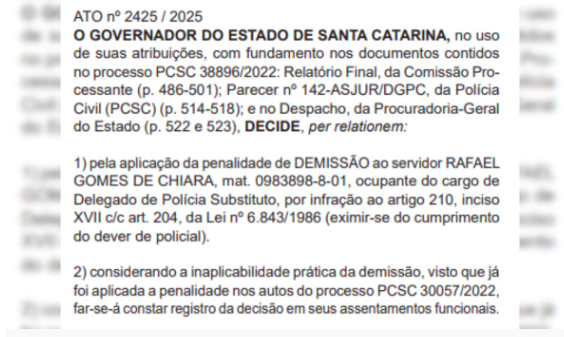 Conforme publicado no Diário Oficial, Rafael de Chiara foi alvo de “exoneração qualificada”, a partir do resultado de uma comissão processante. Destaca-se, na justificativa, de acordo com o documento, infração ao artigo 120, inciso VXII, da lei 6.843/1986, que corresponde a “eximir-se do cumprimento do dever de policial”.