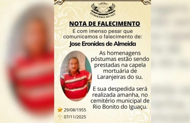 De acordo com informações da funerária, o velório de José Eronides de Almeida ocorreu no domingo (9), na cidade de Laranjeiras do Sul. O enterro ocorreu na segunda-feira (10), no cemitério municipal de Rio Bonito do Iguaçu.