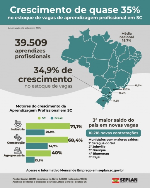 Com 10.218 novas contratações líquidas até setembro, Santa Catarina ocupa o terceiro lugar no país em saldo de novas vagas de aprendizagem, atrás apenas de São Paulo e Minas Gerais.O município de Jaraguá do Sul lidera o ranking estadual com 888 novas contratações, seguido de Joinville (571), Brusque (567), Blumenau (530) e Itajaí (469).