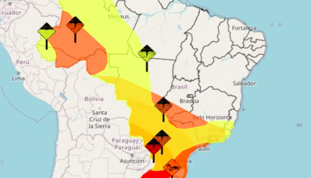 O primeiro alerta começa 1h de domingo e engloba seis estados: Rio Grande do Sul, Santa Catarina, Paraná, Mato Grosso do Sul, São Paulo e Mato Grosso. Já o segundo começa 8h de segunda e inclui Santa Catarina, Paraná, Mato Grosso do Sul, São Paulo, Rio de Janeiro e Mato Grosso.