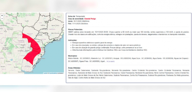 O aviso indica chuva superior a 60 mm/h ou maior que 100 mm/dia, ventos superiores a 100 km/h e queda de granizo. Há grande risco de danos em edificações, corte de energia elétrica, estragos em plantações, queda de árvores, alagamentos e transtornos no transporte rodoviário, conforme o Inmet.