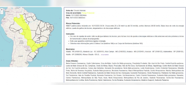 O Inmet também alerta para chuvas intensas de entre 20 e 30 mm/h ou até 50 mm/dia, ventos intensos (40-60 km/h). O aviso é válido entre este sábado (15) e 9h de domingo.