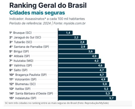 “Afinal, antes de escolher onde morar, é natural que as pessoas se perguntem: “essa cidade é segura para mim e minha família?”. Foi com base nesse tipo de dúvida, tão comum entre nossos clientes, que a MySide decidiu criar este estudo”, diz um trecho da publicação do portal.O levantamento também mostra redução no número catarinense em comparação com o estudo de 2023, que era de 9,2. Entre as cidades mais seguras, Santa Catarina também se destaca, com as três primeiras posições: Brusque, Jaraguá do Sul e Tubarão.