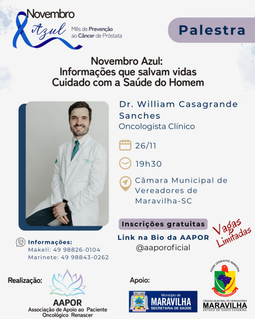 A cidade de Maravilha recebe nesta quarta-feira (26) a palestra “Novembro Azul: Informações que salvam vidas”, iniciativa que busca reforçar a importância do cuidado com a saúde masculina e da prevenção ao câncer de próstata. O encontro será conduzido pelo oncologista clínico Dr. William Casagrande Sanches, a partir das 19h30, no Plenário da Câmara Municipal. A participação é gratuita.