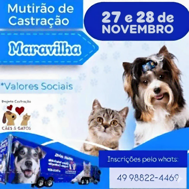 Entre os dias 27 e 28 de novembro, Maravilha recebe a 14ª Campanha “Projeto Carreta Castração Brasil”. A clínica móvel estará na cidade durante este período, oferecendo o serviço de castração de cães e gatos com valores sociais. Quem tiver interesse em mais informações deve entrar em contato através do telefone (49) 9 8822-4469.