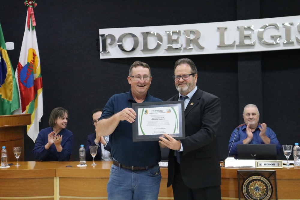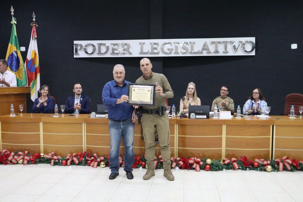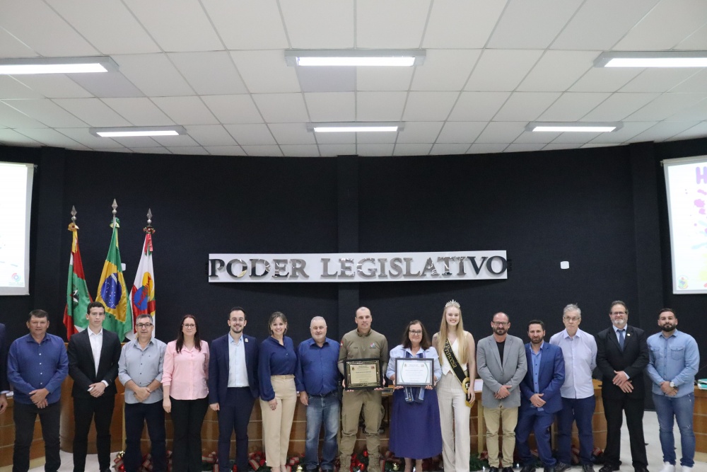 A solenidade iniciou com a apresentação musical das jovens Nicole e Natalie Seidel Canova, seguida da exibição de um vídeo histórico e da leitura da resolução que instituiu a homenagem. O Legislativo entregou placa comemorativa ao comandante da 2ª Companhia da Polícia Militar, Capitão Junior Tatsch, em reconhecimento à atuação da corporação na realização do programa.