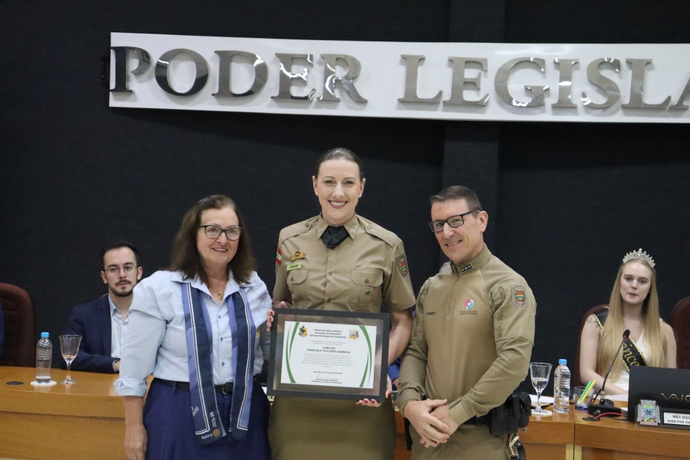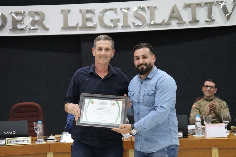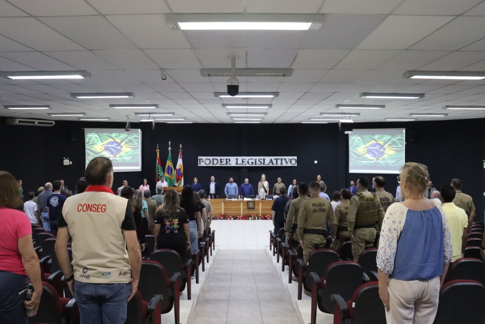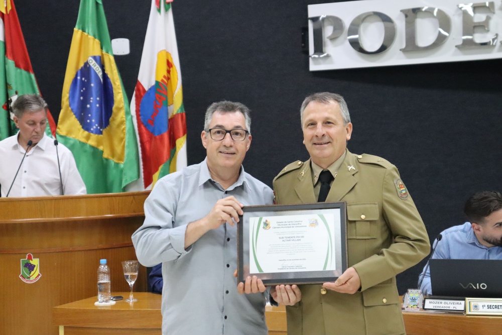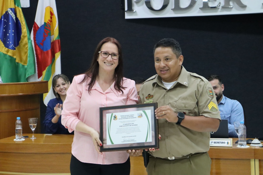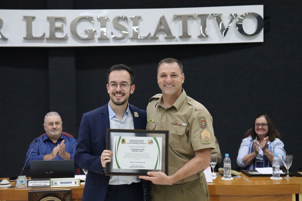 A segunda parte da sessão foi dedicada à homenagem à Polícia Militar pelo marco de 25 anos do PROERD em Maravilha, regulamentada pela Resolução nº 1/2025, de autoria do presidente do Legislativo, vereador Gilmar Francisco Castanha.