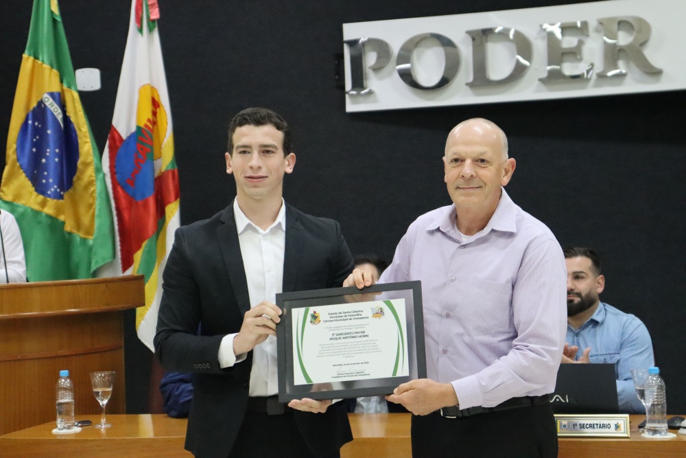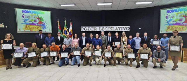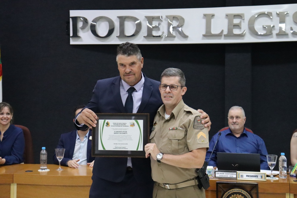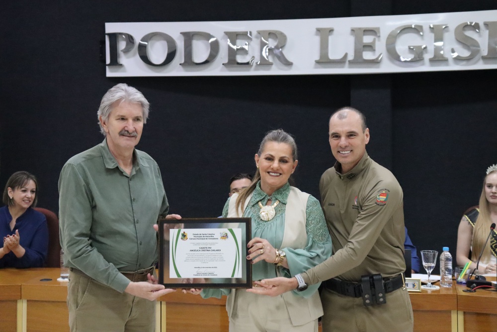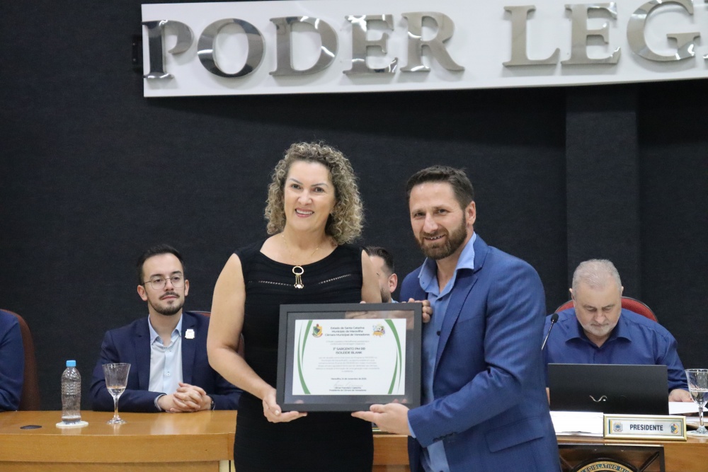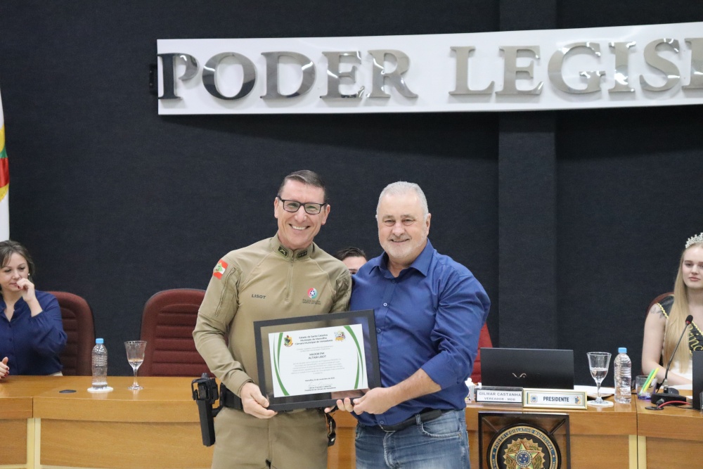 A segunda parte da sessão foi dedicada à homenagem à Polícia Militar pelo marco de 25 anos do PROERD em Maravilha, regulamentada pela Resolução nº 1/2025, de autoria do presidente do Legislativo, vereador Gilmar Francisco Castanha.
