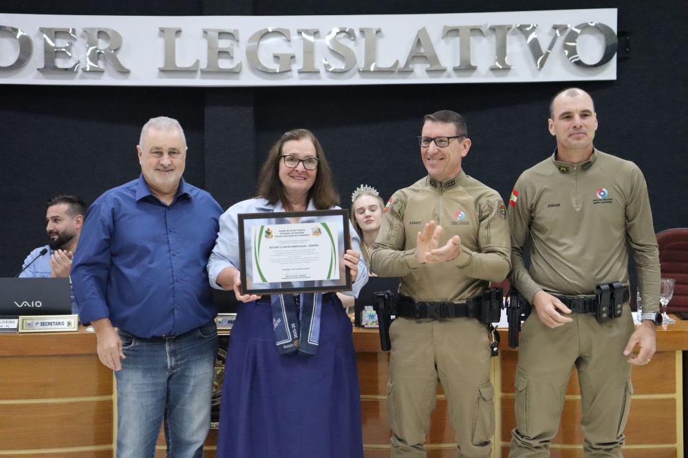 Ainda na sessão, fizeram uso da palavra a presidente do Rotary Club Centro, Sildeni Augustin; o Major Altair Lisot; o Prefeito Vinicius Ventura; e o Presidente da Câmara, vereador Gilmar Castanha.