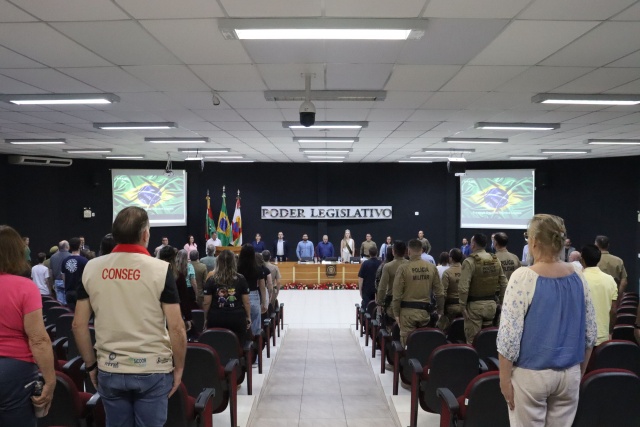 Após formou-se a mesa de honra, composta pelo presidente da Casa, vereador Gilmar Francisco Castanha (MDB); 1º secretário Mozer Matheus de Oliveira (PL); Chefe da Divisão Administrativa do 9º Comando Regional da Polícia Militar da Fronteira (CRPM/Fron), Major Altair Lisot (representando o Comandante do 9º Comando de Polícia Militar da Fronteira, Coronel Jailson Aurélio Frazen); comandante da 2ª Companhia de Polícia Militar, Capitão Junior Tatsch; presidente do Rotary Club de Maravilha – Centro Sildeni Prass Augustin; Prefeito Vinicius Ventura; Vice-Prefeita Nadia Signor e a 2ª Princesa do Município, Suyane Bohrer Mocellin. A sessão prosseguiu com a execução do Hino Nacional e apreciação das matérias em pauta.