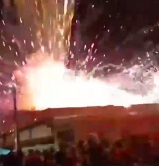 Imagens que circulam nas redes sociais mostram os fogos estourando de cima do telhado de um edifício de único pavimento em frente à Praça Municipal Guido Giacomazzi. Além das pessoas, veículos também foram atingidos e alguns tiveram os vidros quebrados pelo impacto.