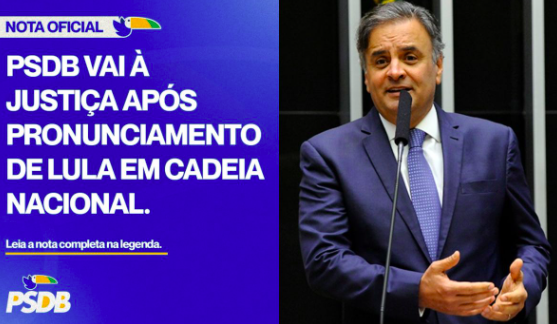 O deputado federal Aécio Neves, que preside o PSDB (Partido da Social Democracia Brasileira), assinou uma nota pública na qual o partido informa que acionará a Justiça brasileira após o pronunciamento de Lula (PT) em cadeia nacional de rádio e televisão neste domingo (30) sobre o Imposto de Renda.