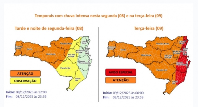 A Defesa Civil de Santa Catarina alerta para a atuação de um ciclone extratropical entre esta segunda e terça-feira, que deixa o tempo instável em todo o Estado. Os temporais com chuva intensa, rajadas de vento e queda de granizo começam já entre a tarde e a noite de segunda, em especial no Grande Oeste e Planalto Norte, onde tempestades severas podem ocorrer. Há risco moderado a alto para ocorrências como alagamentos, enxurradas, destelhamentos, queda de galhos e árvores e danos na rede elétrica.