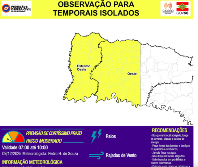 Os ventos do quadrante anordeste também se intensificam ao longo do dia na costa com rajadas entre 55 e 75 km/h, oferecendo risco moderado a pontualmente alto para ocorrências associadas.