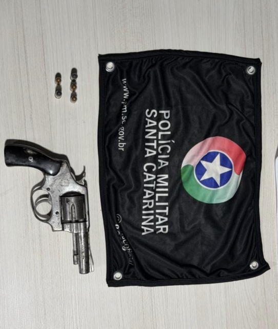 Durante as buscas no local, a Polícia Militar localizou um revólver calibre .32, que estava municiado com seis cartuchos, sendo cinco intactos e um deflagrado. O homem confirmou ser o proprietário da arma e informou não possuir registro.