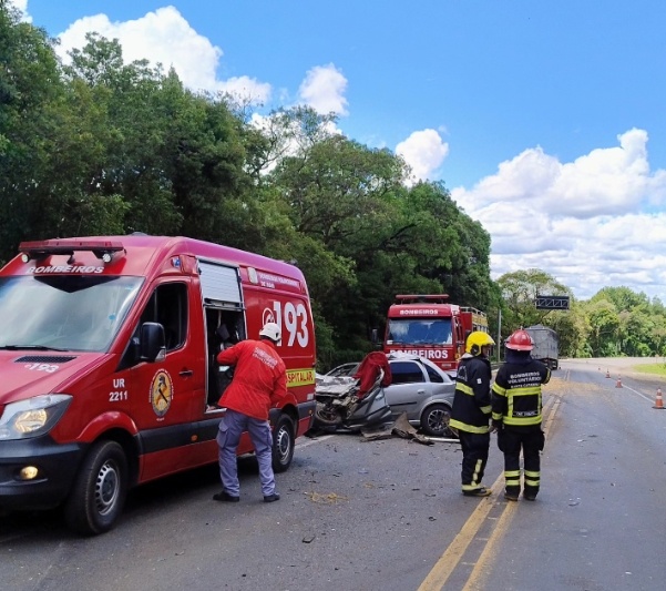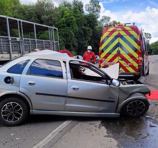 Carro bateu contra caminhão na BR-153 (Fotos: Corpo de Bombeiros)