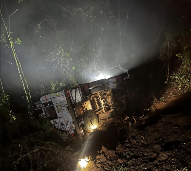 O motorista, um homem maior de idade, já estava fora do caminhão, sentado, consciente e orientado. Ele relatou dores na região lombar, mas apresentava sinais vitais estáveis e informou não possuir comorbidades. Segundo o relato, o veículo teria apresentado uma pane mecânica, desligando repentinamente e travando o volante, o que teria provocado a saída de pista e o capotamento.