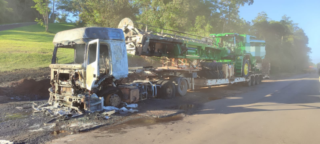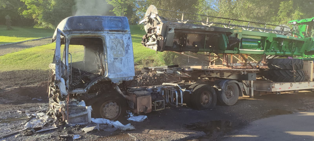 Ao chegar ao local, foi encontrada uma carreta cegonheira carregada colheitadeira e sua plataforma. As chamas estavam concentradas no cavalo trator, e iniciando na parte da plataforma, sentido frente-traseira. Imediatamente os bombeiros realizaram o combate às chamas. O Cavalo Trator era modelo Mercedes Benz Axor 2544 e Semi Reboque Librelato, com placas de Horizontina