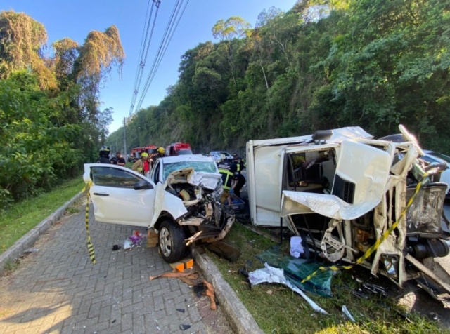 Ainda não há informações sobre a dinâmica da colisão, mas o acionamento ao socorro ocorreu por volta das 5h40min. Os carros e caminhão de pequeno porte que carregava abacaxi trafegavam antes do posto fiscal de Apiúna, no Km 94, quando tudo ocorreu. Duas vítimas, um casal de 52 anos, estavam em um Montana com placas de Joinville.