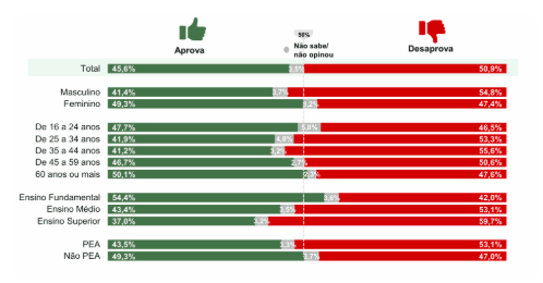 Os maiores índices de desaprovação estão nas faixas etárias de 35 a 44 anos (55,6%) e de 25 a 34 anos (53,3%). Já a aprovação, entre pessoas de 60 anos ou mais (50,1%) e de 16 a 24 anos (47,7%).